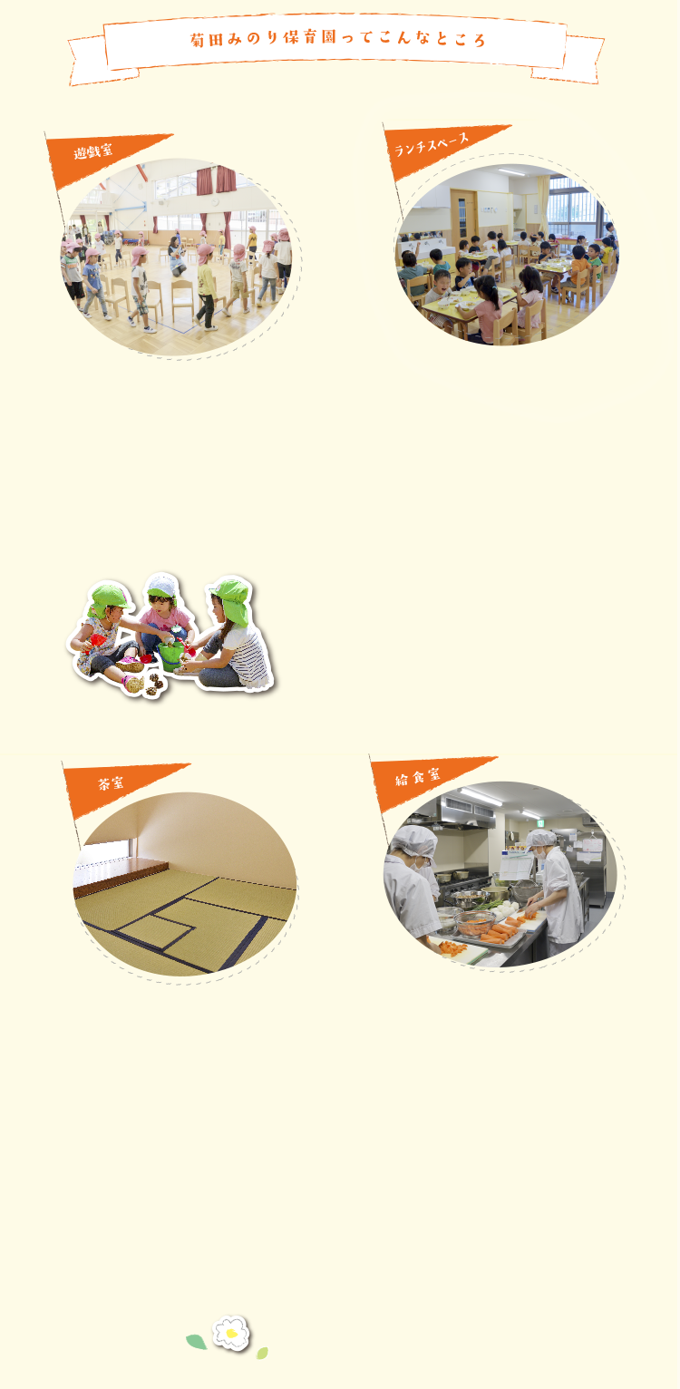 ・身体測定・健康診断(内科健診 幼児年2回 乳児年3回、歯科検診 年2回、眼科検診 4・5歳児のみ年1回)、アレルギー除去食対応、マニュアルに基づく感染拡大の防止